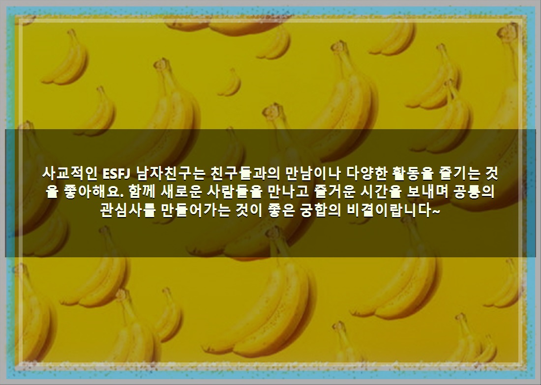 사교적인 ESFJ 남자친구는 친구들과의 만남이나 다양한 활동을 즐기는 것을 좋아해요. 함께 새로운 사람들을 만나고 즐거운 시간을 보내며 공통의 관심사를 만들어가는 것이 좋은 궁합의 비결이랍니다~