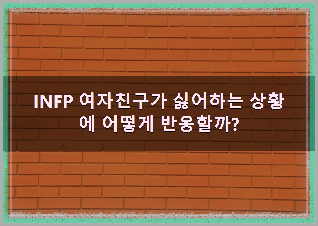 공유드린 정보는 INFP 여자친구가 싫어하는 상황에 어떻게 반응할까? 입니다. 상기정보가 도움이 되셨길 바랍니다.